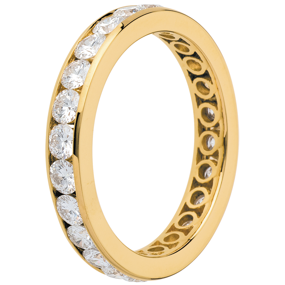 Eine gelbgoldene Kanalfassung hält 23 funkelnde Diamanten im Brillant-Schliff, ein edler Memoire Trauring. 23 Diamanten : 2 Karat - Gelbgold (750/-): 4.7 g. Weitere Abmessungen