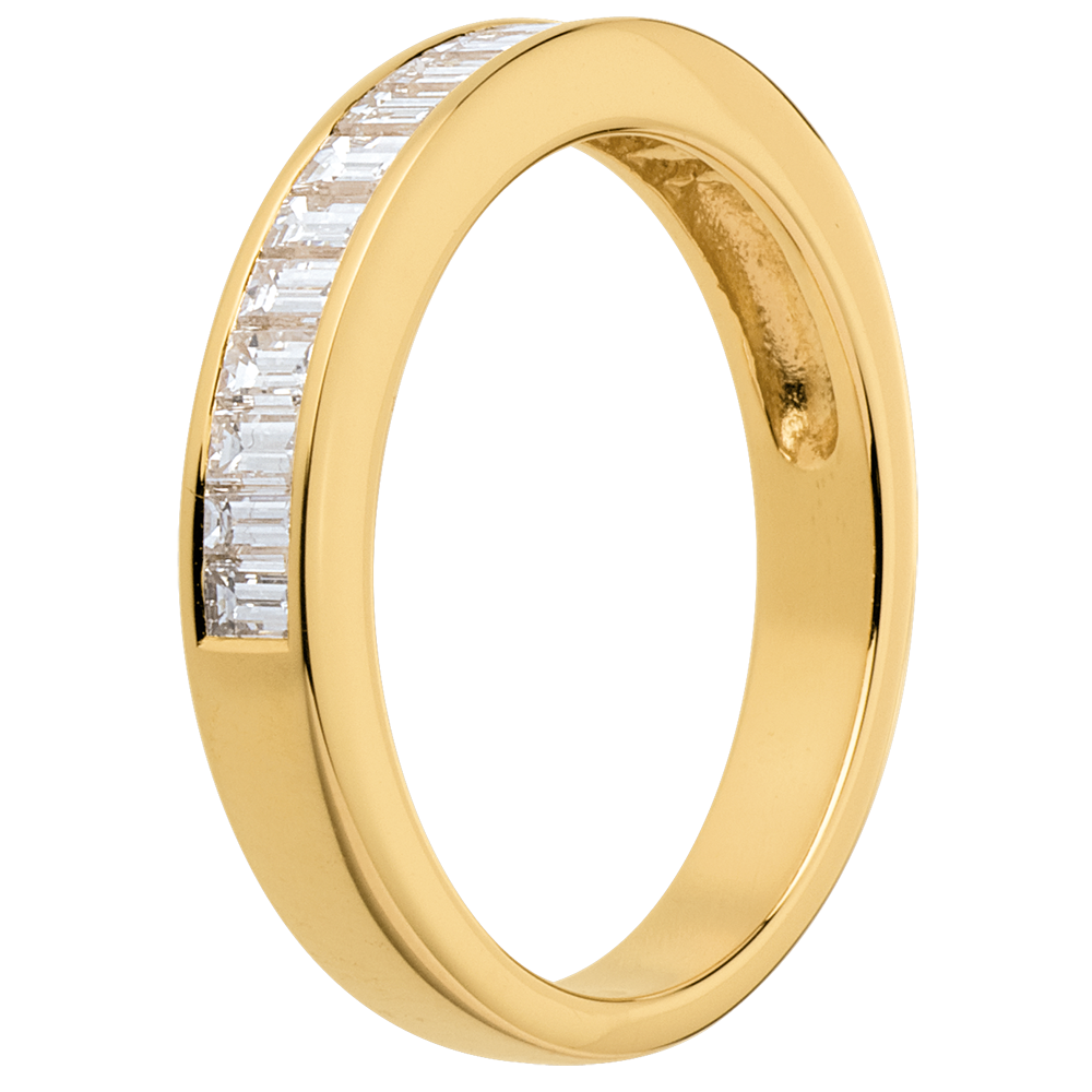 Eine gelbgoldene Kanalfassung hält eine Reihe funkelnder Diamanten im Coussin-Schliff, ein edler Trauring. 16 Diamanten : 0.5 Karat - Gelbgold (750/-): 3.8 g. Weitere Abmessungen