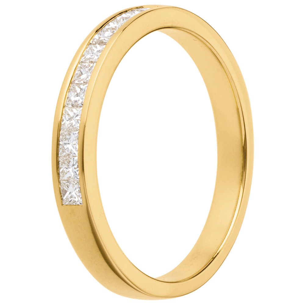 Eine gelbgoldene Kanalfassung hält 11 funkelnde Diamanten im Coussin-Schliff, ein edler Trauring.