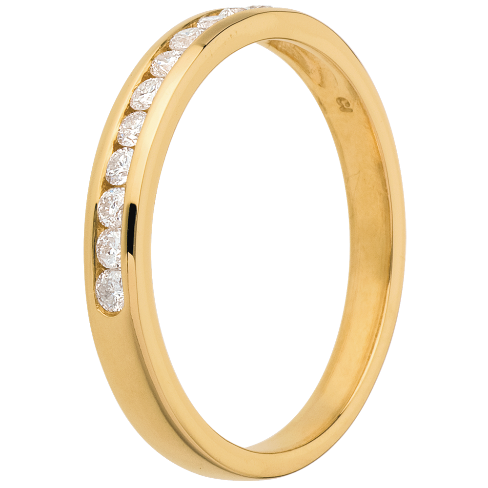 Eine gelbgoldene Kanalfassung hält 11 funkelnde Diamanten im Brillant-Schliff, ein edler Trauring. 11 Diamanten : 0.2 Karat - Gelbgold (750/-): 2.2 g. Weitere Abmessungen