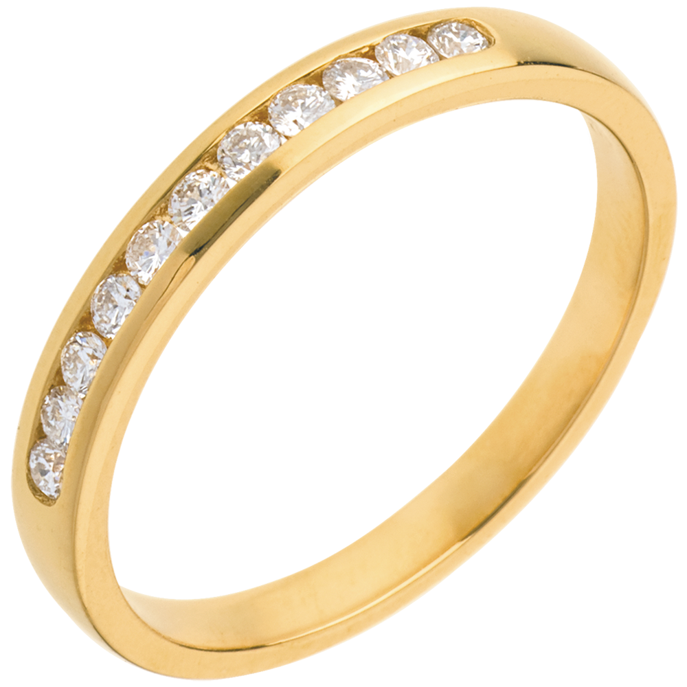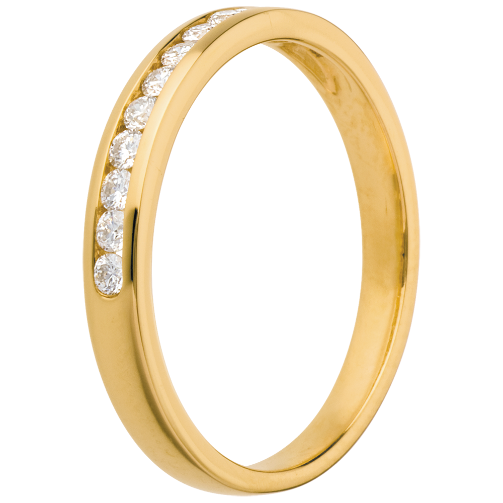 Eine gelbgoldene Kanalfassung hält 11 funkelnde Diamanten im Brillant-Schliff, ein edler Trauring. 11 Diamanten : 0.2 Karat - Gelbgold (750/-): 2.2 g. Weitere Abmessungen