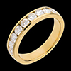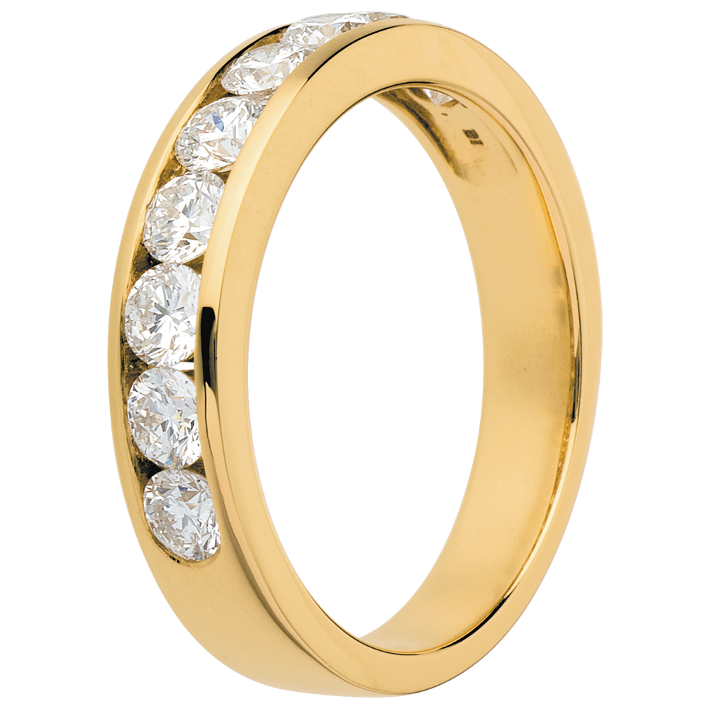 Eine gelbgoldene Kanalfassung hält 9 funkelnde Diamanten im Brillant-Schliff, ein edler Trauring. 9 Diamanten : 1 Karat - Gelbgold (750/-): 3.8 g. Weitere Abmessungen