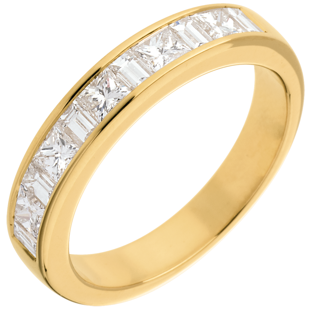 Eine gelbgoldene Kanalfassung hält eine Reihe funkelnder Diamanten im Coussin-Schliff, ein edler Trauring. 1 Diamant : 1 Karat - Gelbgold (750/-): 4.6 g. Weitere Abmessungen