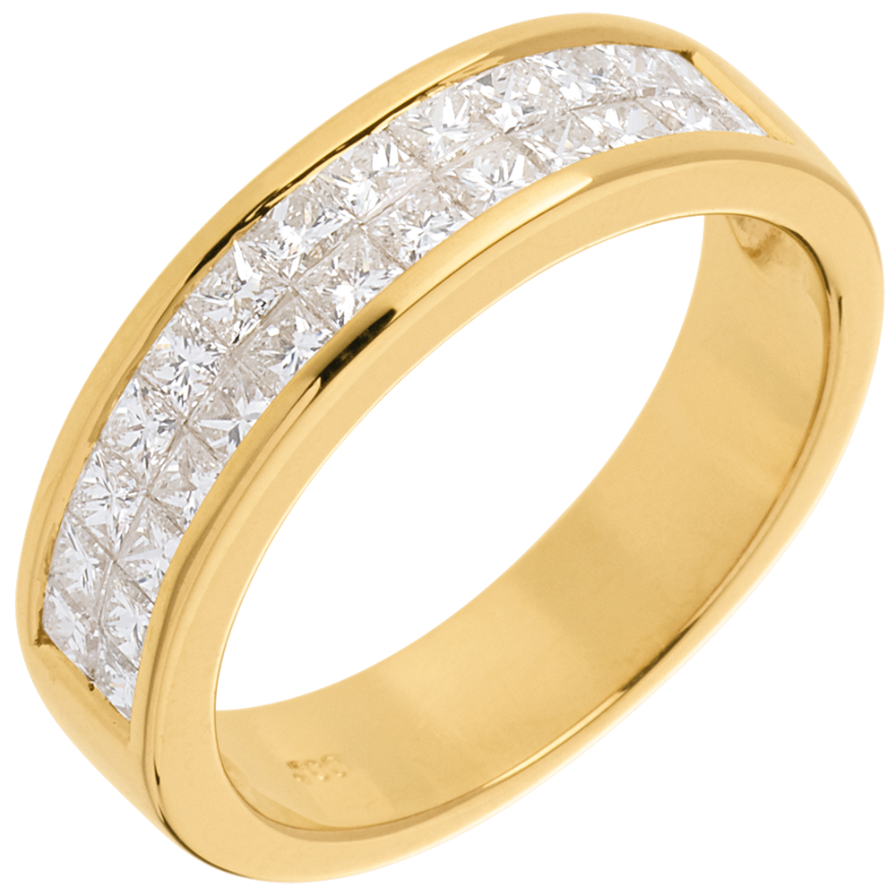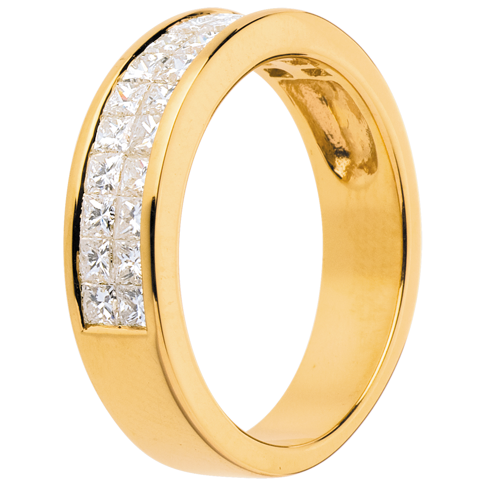 Eine gelbgoldene Kanalfassung hält zwei Reihen funkelnder Diamanten im Coussin-Schliff, ein edler Trauring.