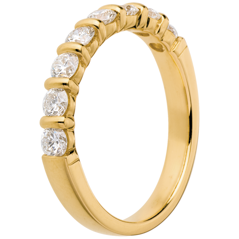 Eine gelbgoldene Krappenfassung hält 8 funkelnde Diamanten, ein edler Trauring.