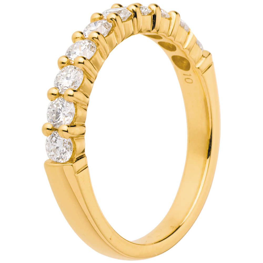 Eine gelbgoldene Krappenfassung hält 10 funkelnde Diamanten, ein edler Trauring.