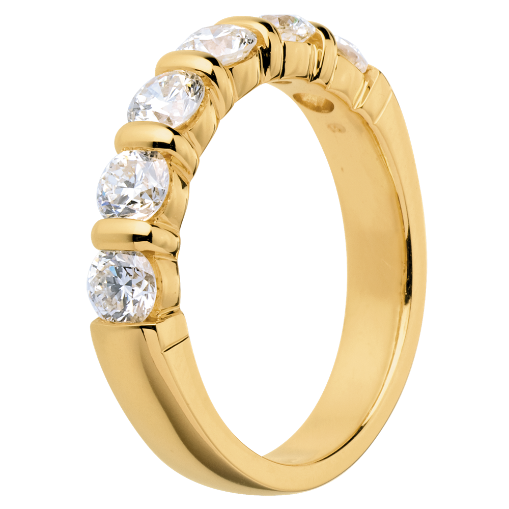 Eine gelbgoldene Krappenfassung hält 6 funkelnde Diamanten, ein edler Trauring.