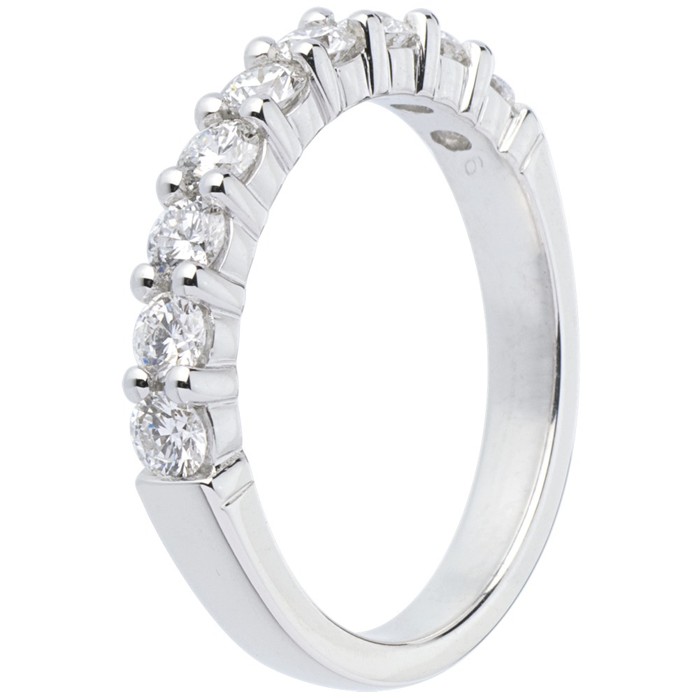 Eine weissgoldene Krappenfassung hält 9 funkelnde Diamanten, ein edler Trauring.