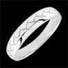 Ein Trauring aus Weißgold an den Seiten abgeschrägt mit einem Webemuster in der Mitte.
