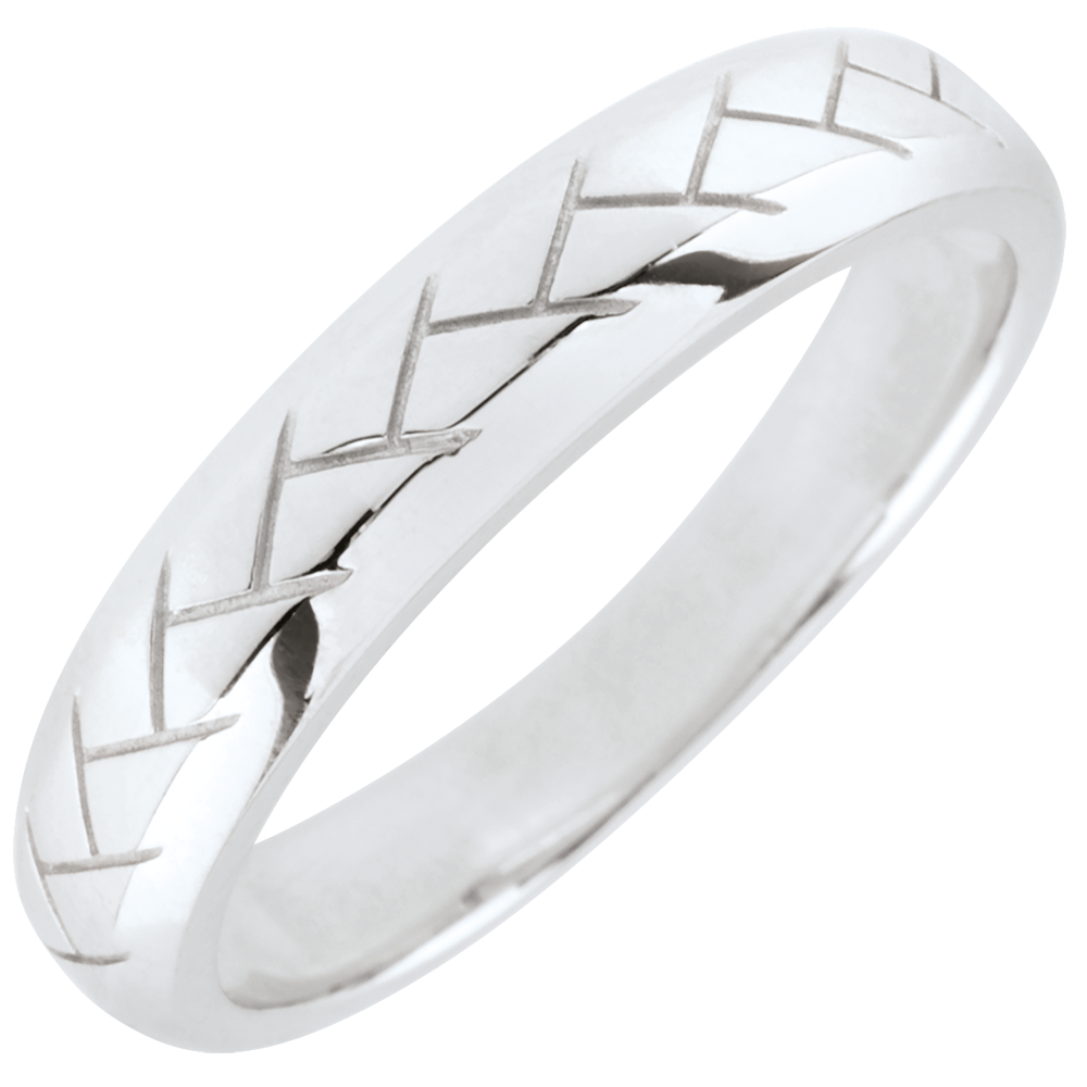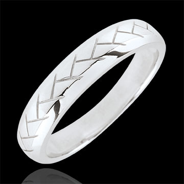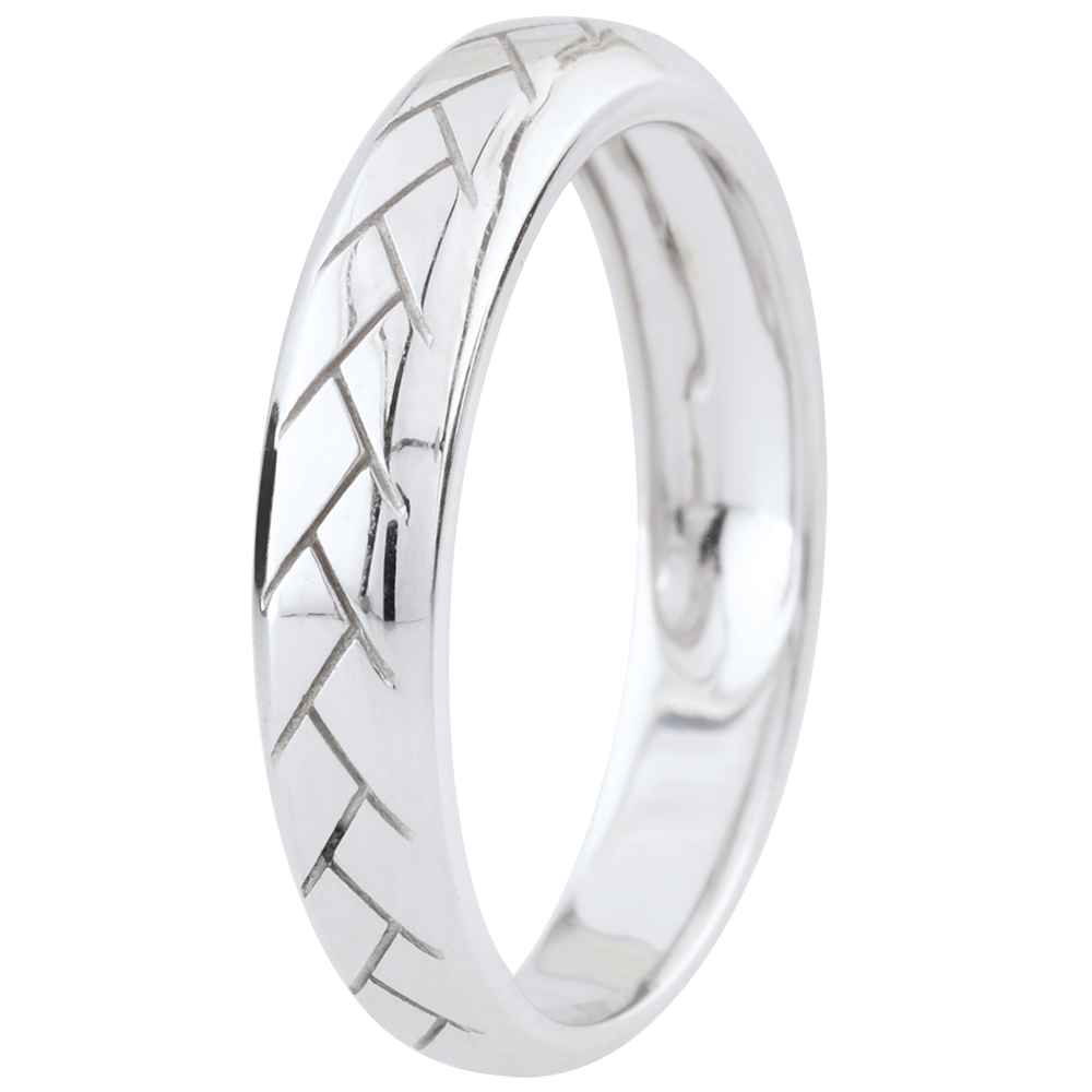 Ein Trauring aus Weißgold an den Seiten abgeschrägt mit einem Webemuster in der Mitte.