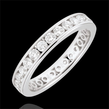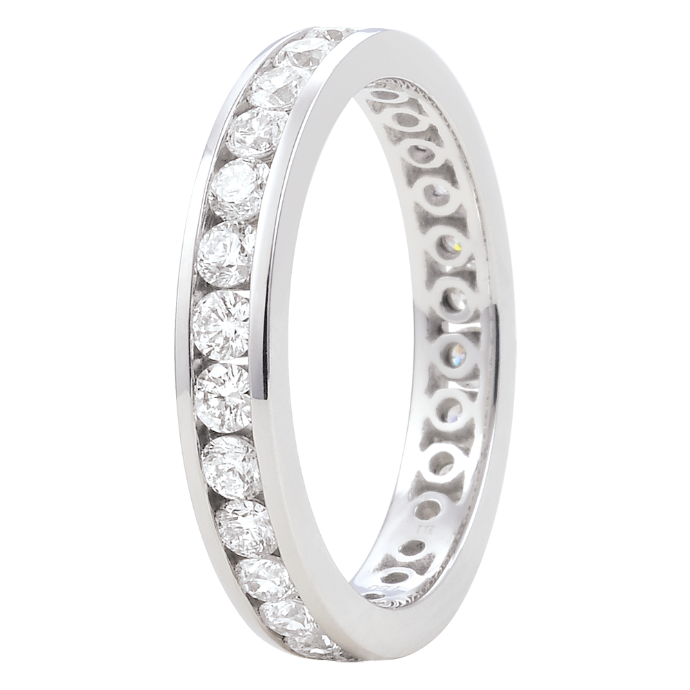Dieser Trauring verkörpert das perfekte Zusammenspiel eines weißgoldenen Ringes, welcher mit rundgeschliffenen Diamanten in Kanalfassung besetzt ist. Dieses Schmuckstück steht symbolisch für ein außergewöhnliche und beständige Verbindung.