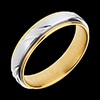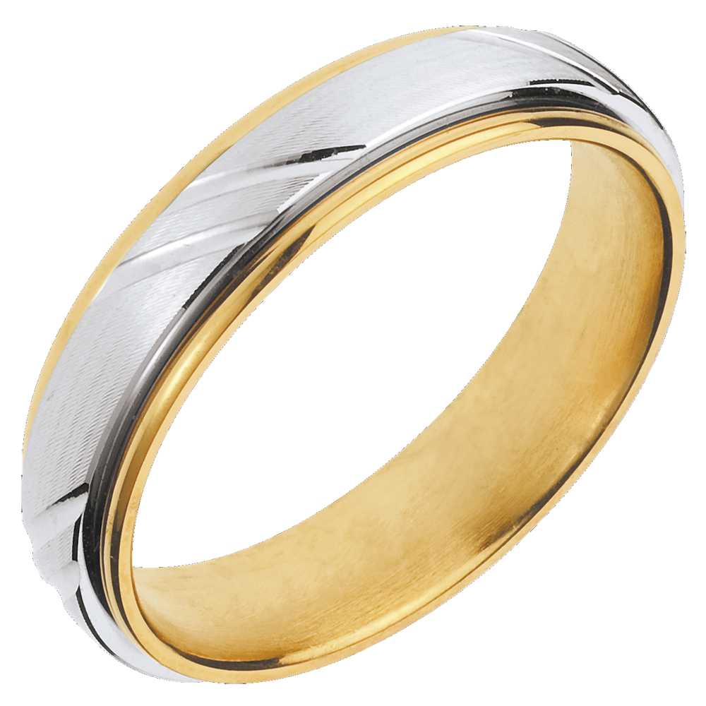 Ein mit Gravur verzierter Weissgoldring wird von Gelbgold eingerahmt.