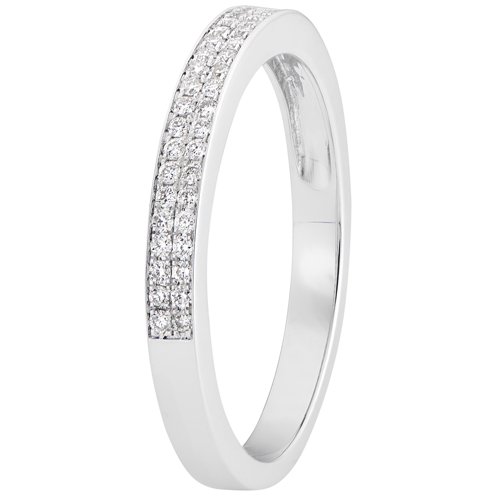 Eine halbpavierter, doppelreihiger Ehering - ein unbestrittener und zeitloser Klassiker der Juwelierszene. 42 Diamanten : 0.14 Karat - Weißgold (375/-): 2.3 g. Weitere Abmessungen