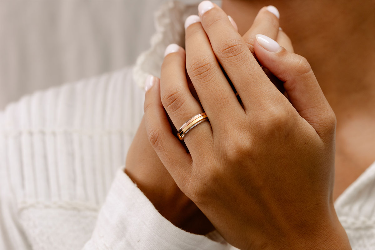 All unsere Schmuckstücke bestehen aus Edelmetallen: 9 Karat (37,5 % reines Gold) oder 18 Karat (75 % Gold), 925er Silber oder Platin. Jedes Stück ist zertifiziert und punziert. Je nach Modell können Sie ein einfarbiges Metall oder eine Kombination aus zwei oder drei Goldarten wählen.