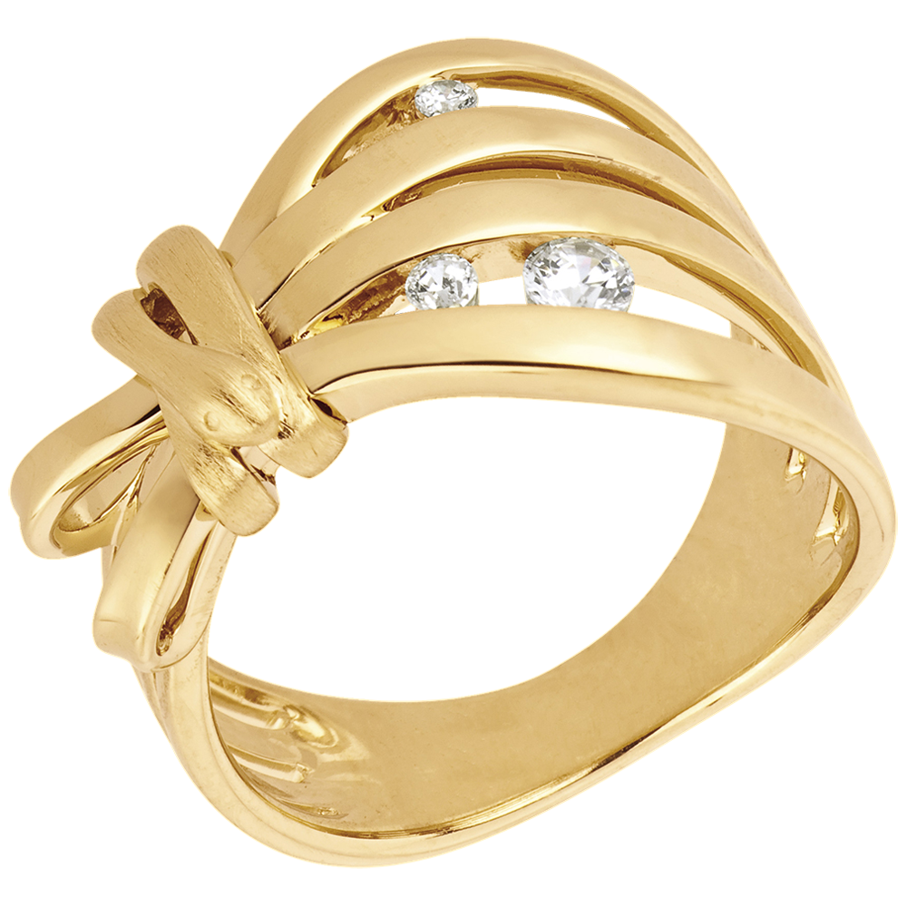 Die kurvige Form dieses Ringes ist der Inbegriff von Eleganz und Sinnlichkeit. Im perfekten und makellosen Paradies stünde dieser Ring für Versuchung und natürliche Schönheit. Gezeichnet von Thais Takase, ESMOD. 3 Diamanten : 0.14 Karat - Gelbgold (750/-): 5.7 g. Weitere Abmessungen
