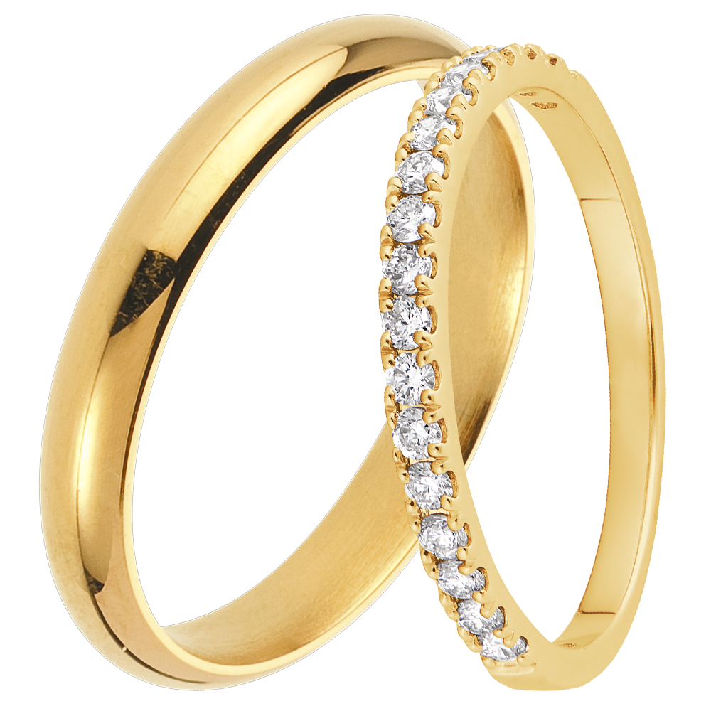 Ein elegantes Ehering-Paar für Sie & Ihn. Für Sie: ein halb mit 18 Diamanten (gesamt 0,26 Karat) besetzter Ring, für Ihn: ein klassischer 3 mm Gelbgoldring.