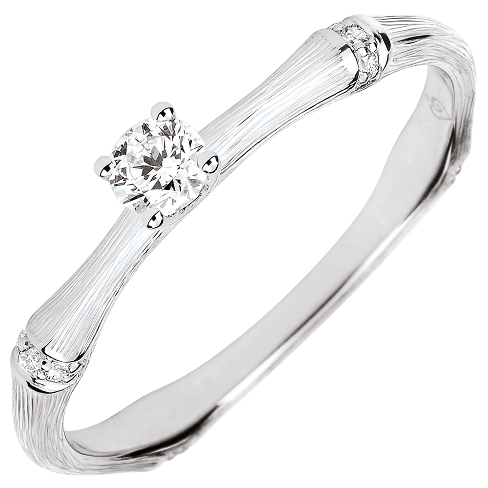 Ein weicher und geschmeidiger Bambusstrang verwandelt sich in einen ewigen Verlobungsring. Die charakteristischen Knoten des Bambus aus Weißgold werden von Diamanten geschmückt um den Solitärdiamanten perfekt in Szene zu setzen. Der in Handarbeit erzielte Matteffekt verleiht dem Schmuckstück ein authentisches und natürliches Erscheinungsbild.