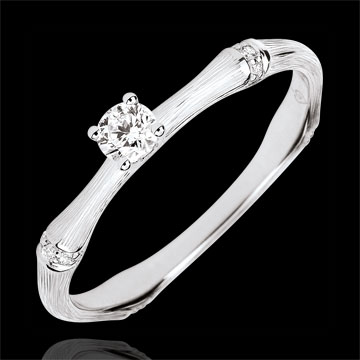 Ein weicher und geschmeidiger Bambusstrang verwandelt sich in einen ewigen Verlobungsring. Die charakteristischen Knoten des Bambus aus Weißgold werden von Diamanten geschmückt um den Solitärdiamanten perfekt in Szene zu setzen. Der in Handarbeit erzielte Matteffekt verleiht dem Schmuckstück ein authentisches und natürliches Erscheinungsbild.