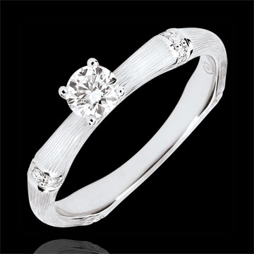 Ein weicher und geschmeidiger Bambusstrang verwandelt sich in einen ewigen Verlobungsring. Die charakteristischen Knoten des Bambus aus Weißgold werden von Diamanten geschmückt um den Solitärdiamanten perfekt in Szene zu setzen. Der in Handarbeit erzielte Matteffekt verleiht dem Schmuckstück ein authentisches und natürliches Erscheinungsbild.
