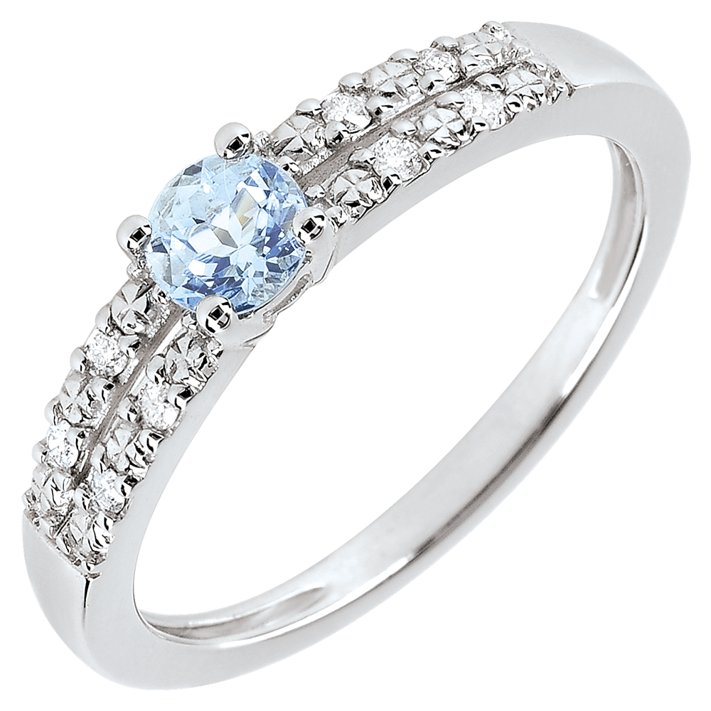 Auf dem zweireihig mit glitzernden Diamanten besetzten Ring in Weißgold thront zentral ein Acquamarin. Reinheit und Einfachheit zeichnen diesen eingefassten Solitaire aus.