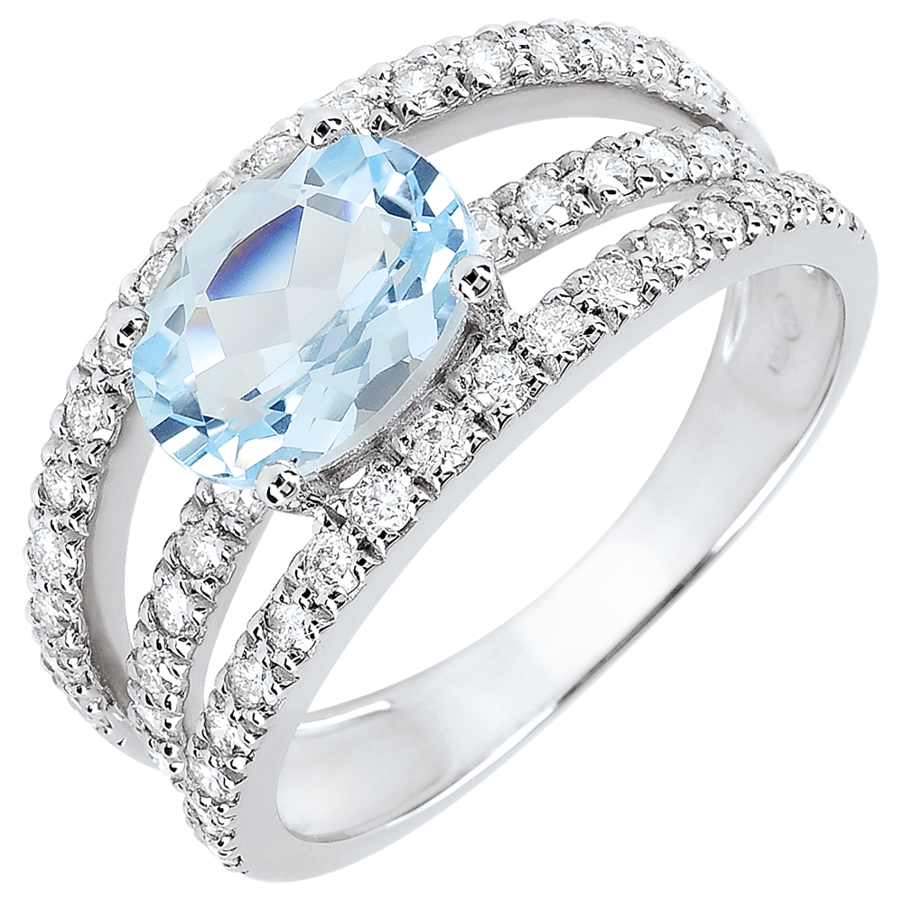 Der zentrale Stein ist ein ovaler blauer Topas mit 1,571 Karat und Very Good Qualität.