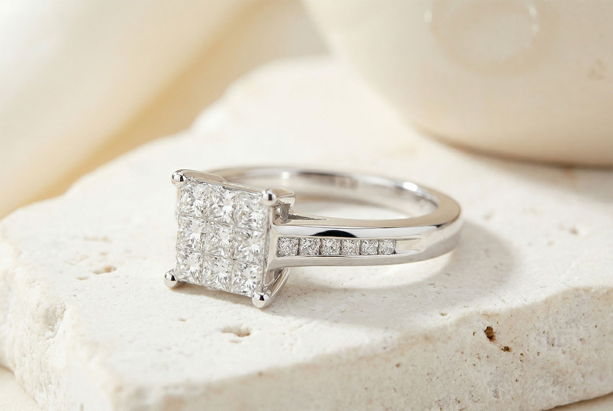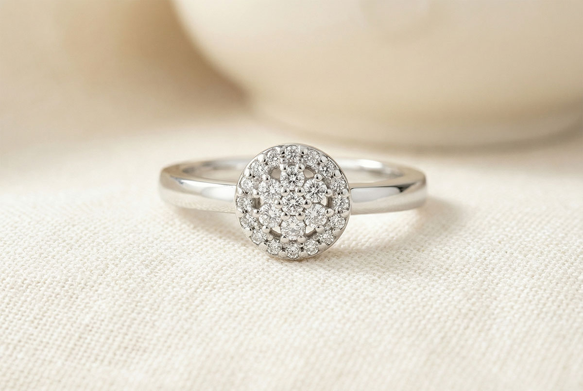 MEHR ERFAHRENEin Cluster ist eine Komposition aus kleinen Diamanten, die zusammengefügt werden, um den Effekt eines größeren Steins zu erzeugen, mit verstärktem Funkeln und einem hervorragenden Preis-Leistungs-Verhältnis.