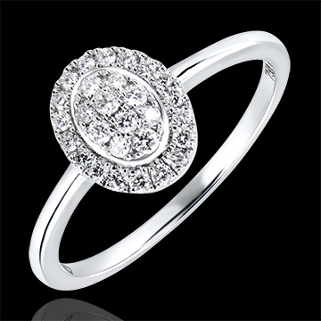 Der zarte Glanz eines ovalen Diamantpaves, gekrönt von einem Diamantenhalo. Ein feiner und subtiler Ring, voller Sanftmut. 3 Diamanten : 0.24 Karat - Weißgold (375/-): 1.9 g. Pavé aus natürlichen Diamanten : 28 - Weitere Abmessungen