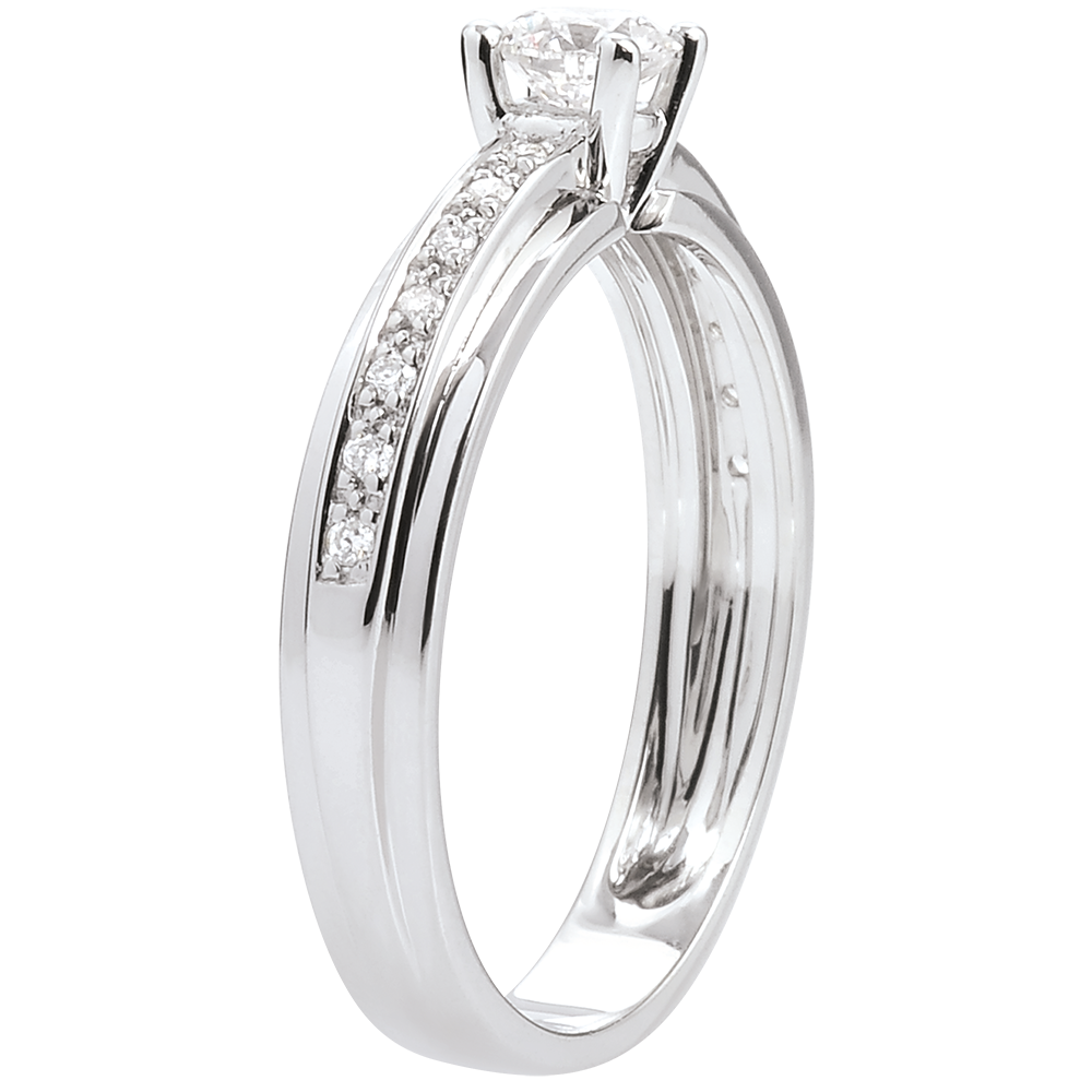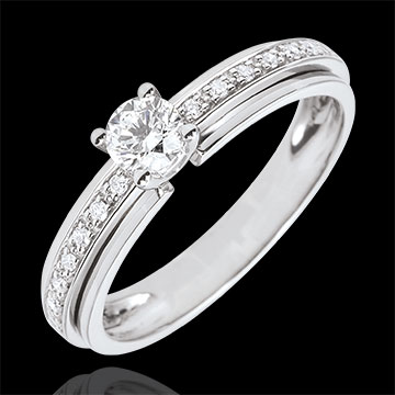 Dieser Solitärdiamant wird sorgfältig von vier Krappen gehalten und posiert auf einem Ring in Weißgold, welcher von einem edlen Brillantpavé geziert wird. 15 Diamanten : 0.32 Karat - Weißgold (375/-): 2.4 g. Weitere Abmessungen